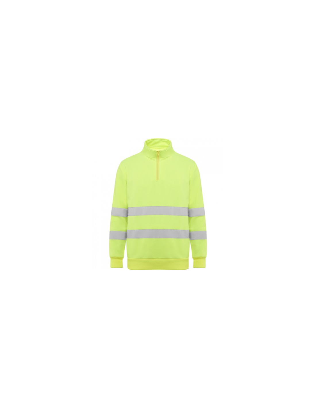 Sudadera de alta visibilidad con media cremallera y cuello alto con protector de barbilla y tirador, cubrecosturas reforzado en el interior del cuello, bandas reflectantes horizontales en torso y mangas.